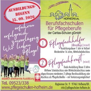 Warum gerade Hofheim? Mitten in den Haßbergen! Eigentlich ganz einfach! Wir sind eine kleine, familiäre Schule, in der viel Wert auf eine fachlich fundierte Ausbildung gelegt und jede*r Auszubildende in seinem „Mensch sein“ angenommen und respektiert wird. Wir bemühen uns beständig um individuelle Förderung und pflegen ein Haus der offenen Türen.