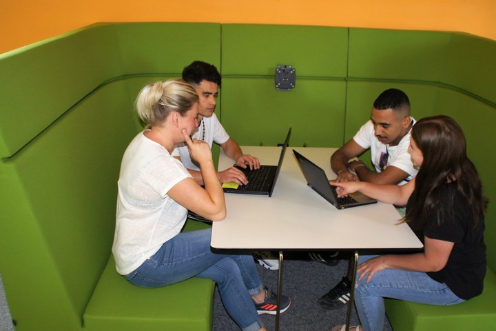Kurz vor den Sommerferien bekamen wir unsere neuen Schulmöbel, d.h. eine Vis-aVis-Lounge mit Bildschirm, Strom- und USB-Anschluss für intensive Grupenarbeiten – natürlich schallisoliert. Außerdem zwei ebenfalls schallisolierte „Sofas“, die zum