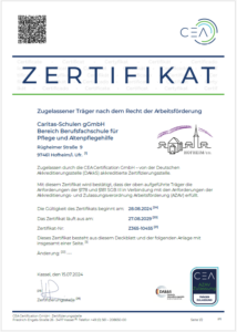 Gemäß § 84 SGB III und der AZAV wurde den Berufsfachschulen für Altenpflege und Altenpflegehilfe durch die CertEuropA GmbH eine Zulassung der Weiterbildungsmaßnahmen des Bildungsträgers für Förderung der beruflichen Weiterbildung nach dem Recht der Arbeitsförderung erteilt.